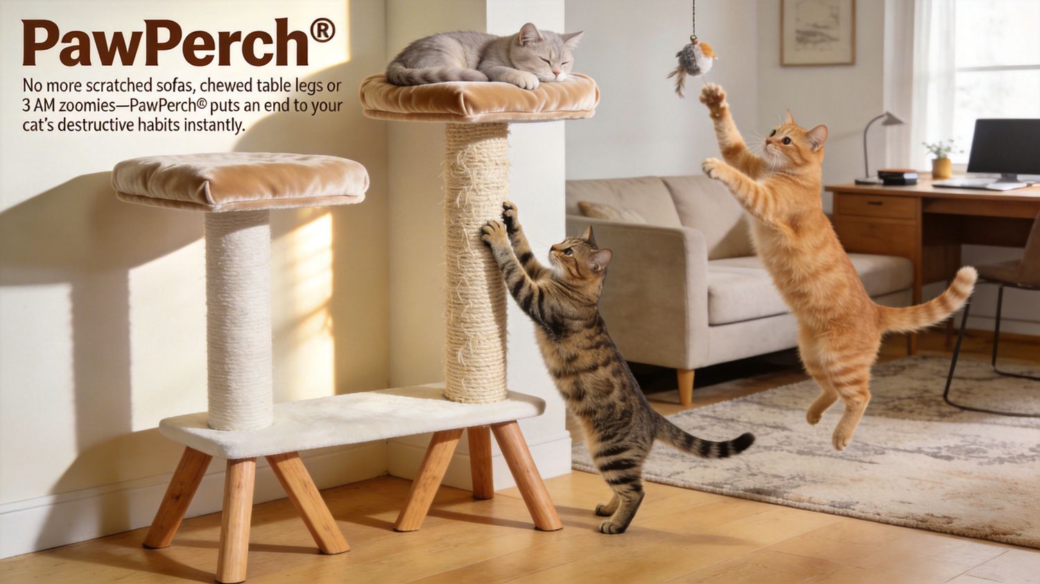 No more scratched sofas, chewed table legs or 3 AM zoomies—PawPerch® puts an end to your cat’s destructive habits instantly. Picture your feline curling up on the plush top perch for a sunlit nap, stretching to scratch the textured post while you work from home, or pouncing on the hanging toy during playtime; it fits seamlessly in your living room, bedroom or home office without cluttering your space. Crafted with solid pine legs that stay steady mid-leap, dense fray-resistant sisal rope for endless scratching, and a machine-washable velvet cushion that stays soft against fur, PawPerch® keeps your cat happy and your home looking sleek.
